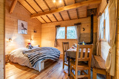 Une pièce avec un lit double, un canapé-lit convertible, une table et un poêle à bois, vaisselles et une bouilloire. Une salle d'eau avec toilettes sèches et lavabo (pas de douche). Une prise à disposition pour les petits appareils (téléphone, ordinateur, bouilloire...).