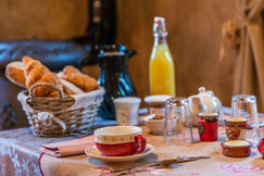 pain et viennoiseries de la boulangerie de Bellevaux, fromage (chèvre ou vache), yaourt fermier, jus de fruit de la Maison Lacroix à Cercier, thé, café, fruits...